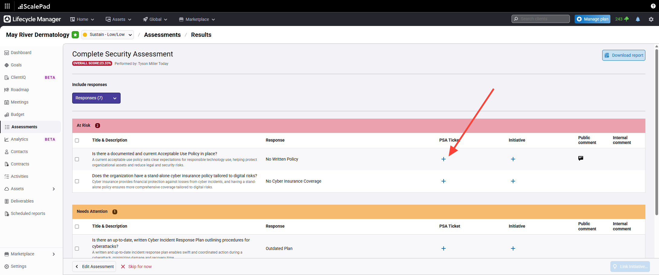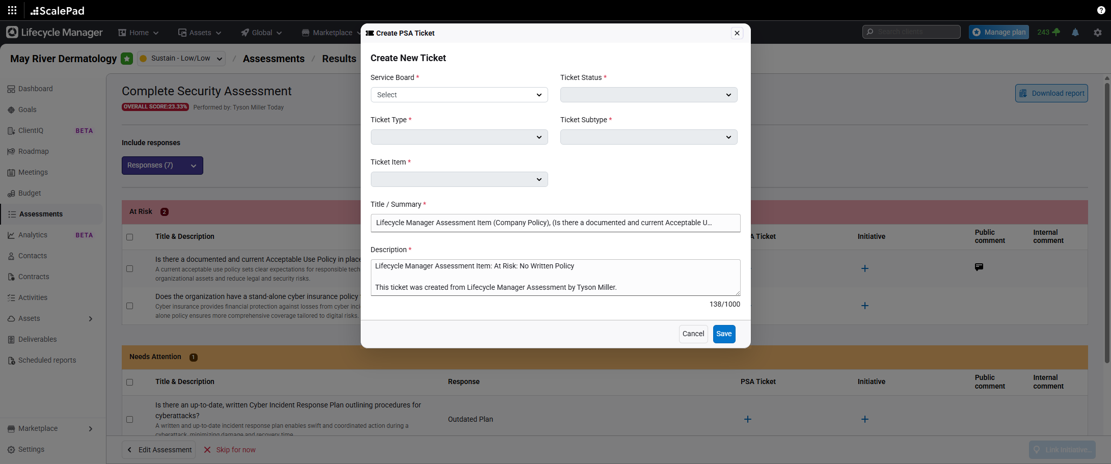 Select Create a PSA ticket to open a ConnectWise ticket for items needing service handling.