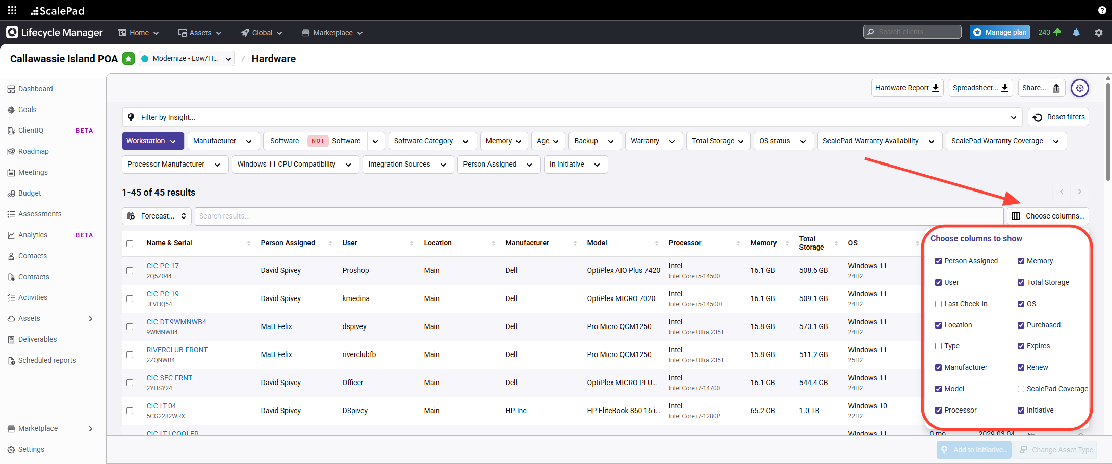 Select preferred columns, including Last Check-In Date, Processor, and Storage (from Automate Sync).