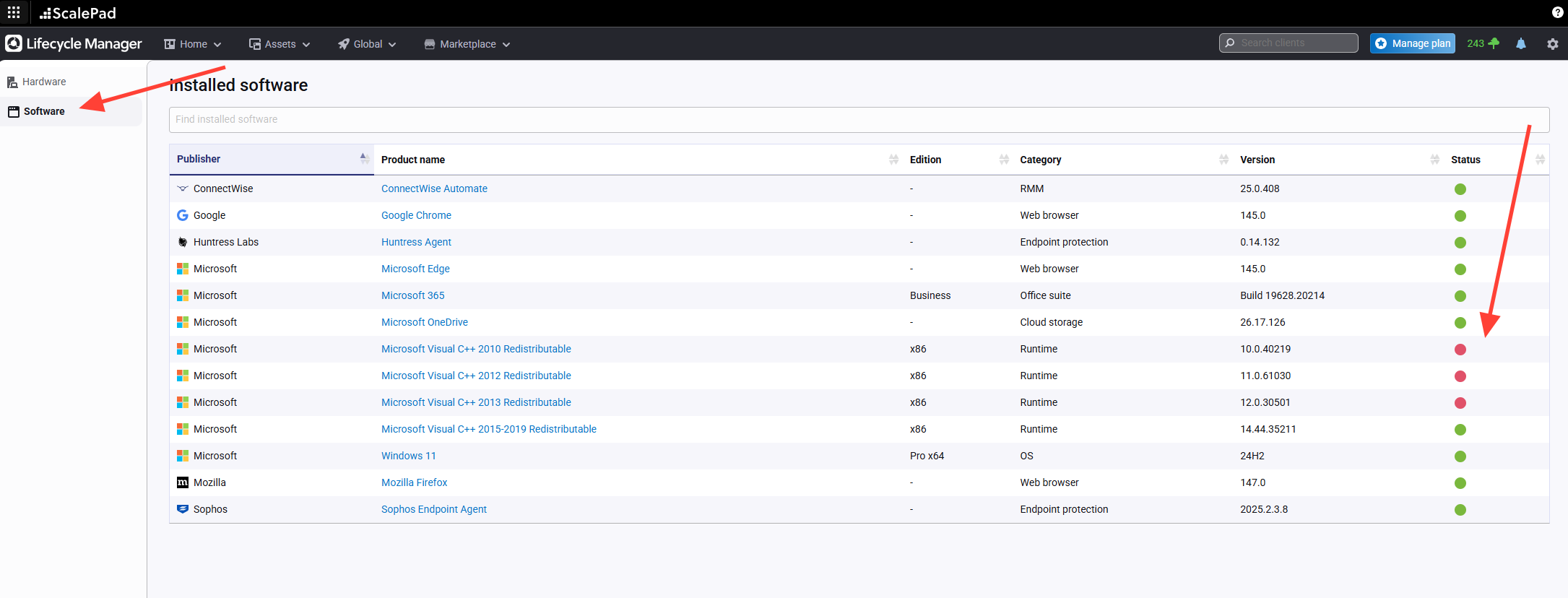 Click the Software tab to see detected software and any associated flags, such as out of support.