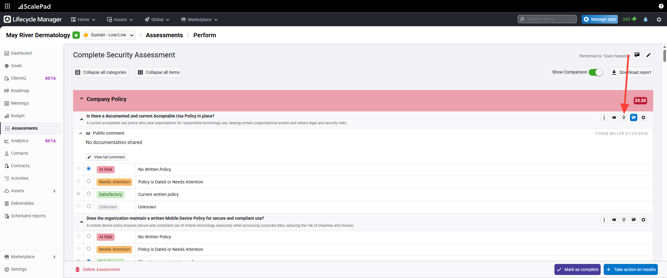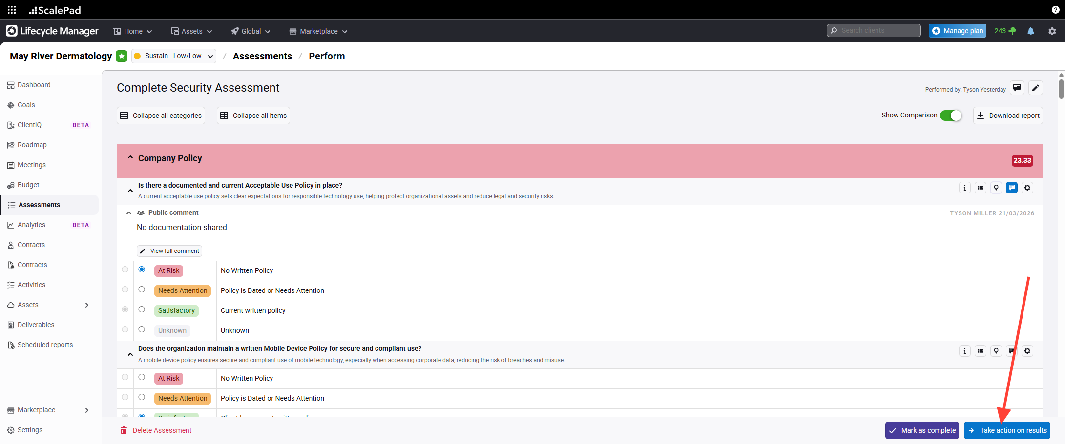 Click Take action on results to view available actions for assessment results.